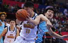 12月15日,青岛崂山啤酒队球员吕俊虎在比赛中防守四川丰谷酒业队球员左朕年。新华社记者 李紫恒 摄